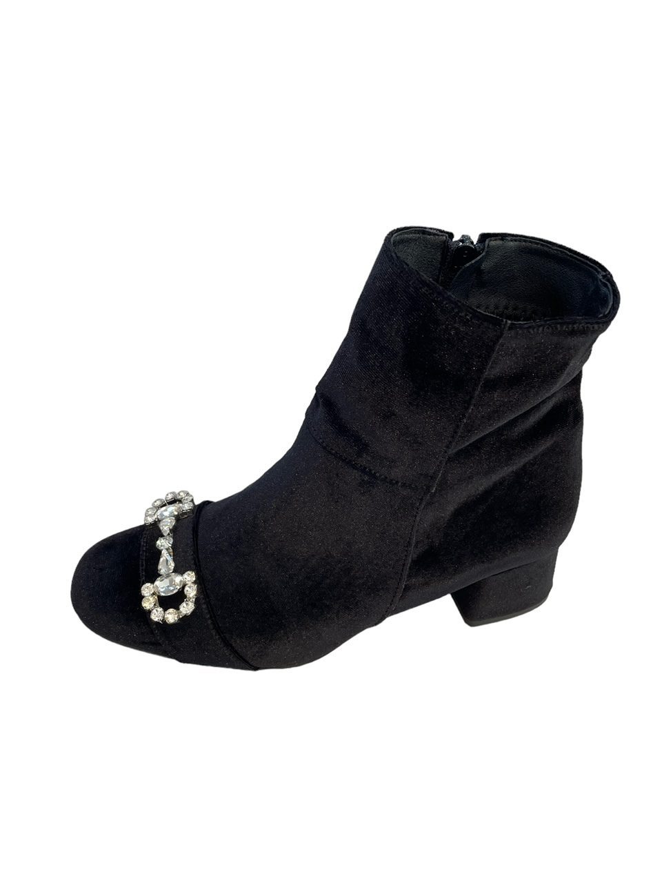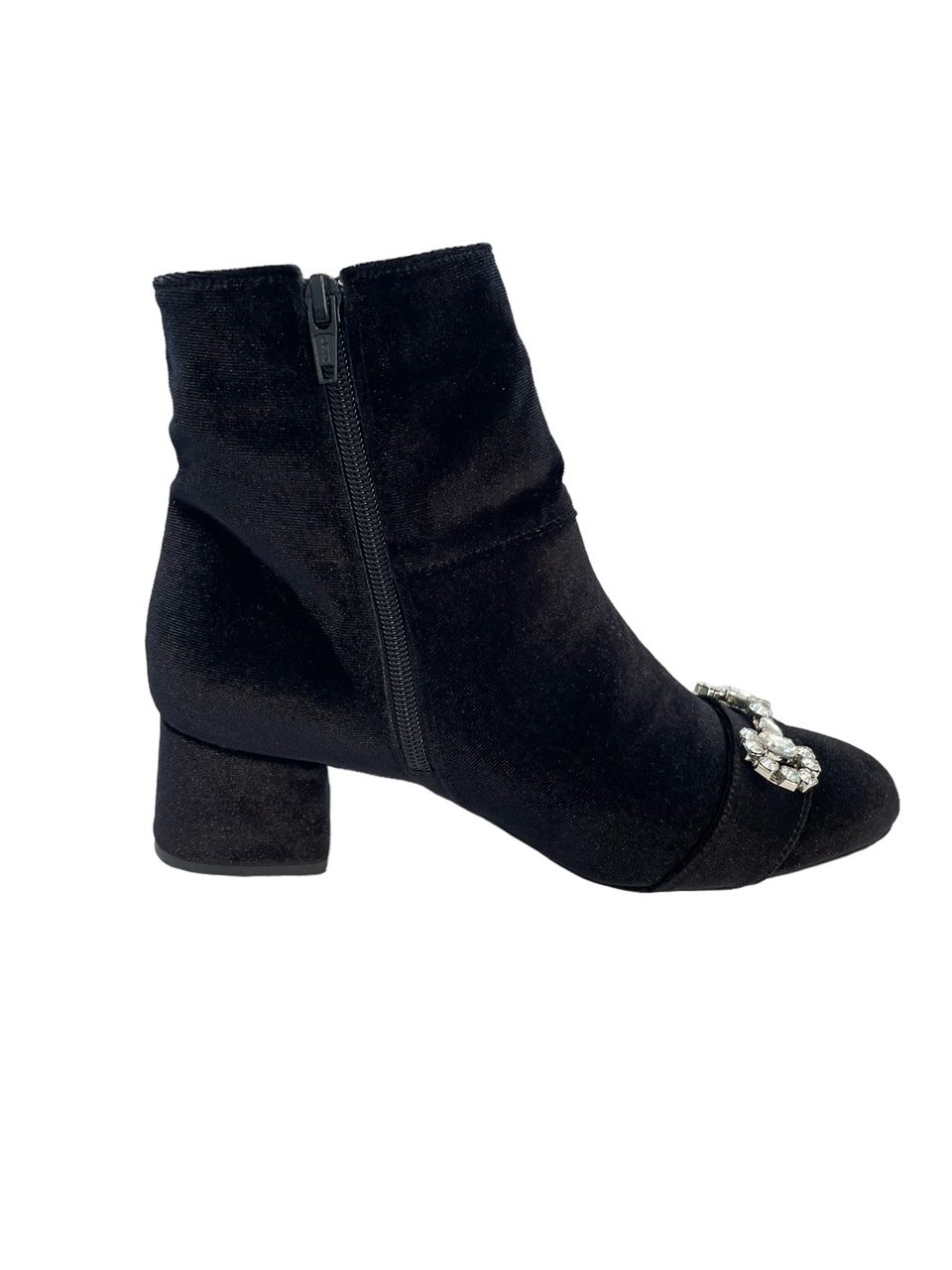 Γυναικεία μποτάκια Smart Cronos σε μαύρο χρώμα, από βελούδο υψηλής ποιότητας. Διαθέτουν διακοσμητική ασημί μεταλλική αγκράφα, χαμηλό τετράγωνο τακούνι και φερμουάρ στην εσωτερική πλευρά.