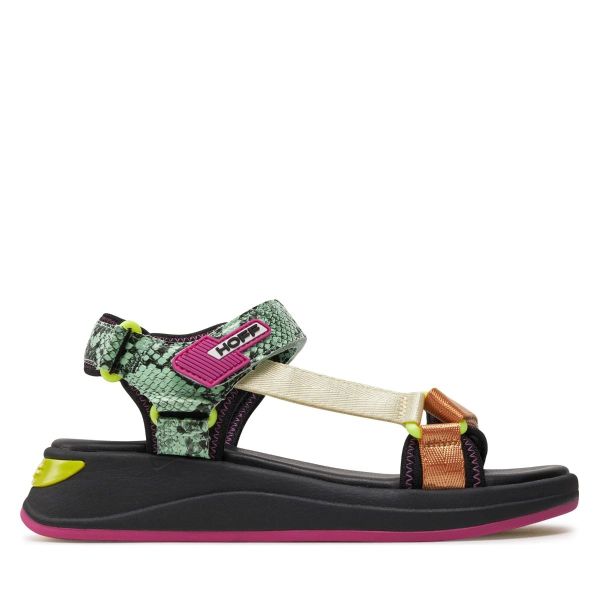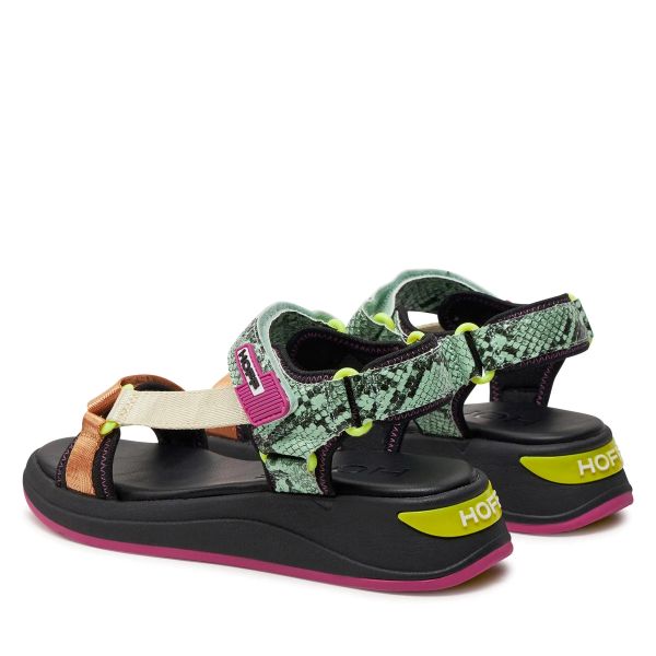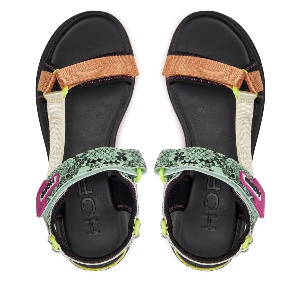 Γυναικεία πέδιλα Hoff, σε μαύρο χρώμα με λεπτομέρειες πράσινες, μπεζ και μωβ. Κατασκευασμένα από γνήσιο δέρμα και ύφασμα. Διαθέτουν κούμπωμα velcro, αντιολισθητική σόλα και εσωτερική, με αυλακώσεις, μαλακή επένδυση που εμποδίζει την ολίσθηση του ποδιού, ενώ παράλληλα προσφέρει άνεση και στήριξη. Η μοντέρνα και περίτεχνη κατασκευή τους τα καθιστά ιδανικά για κάθε μέρα.