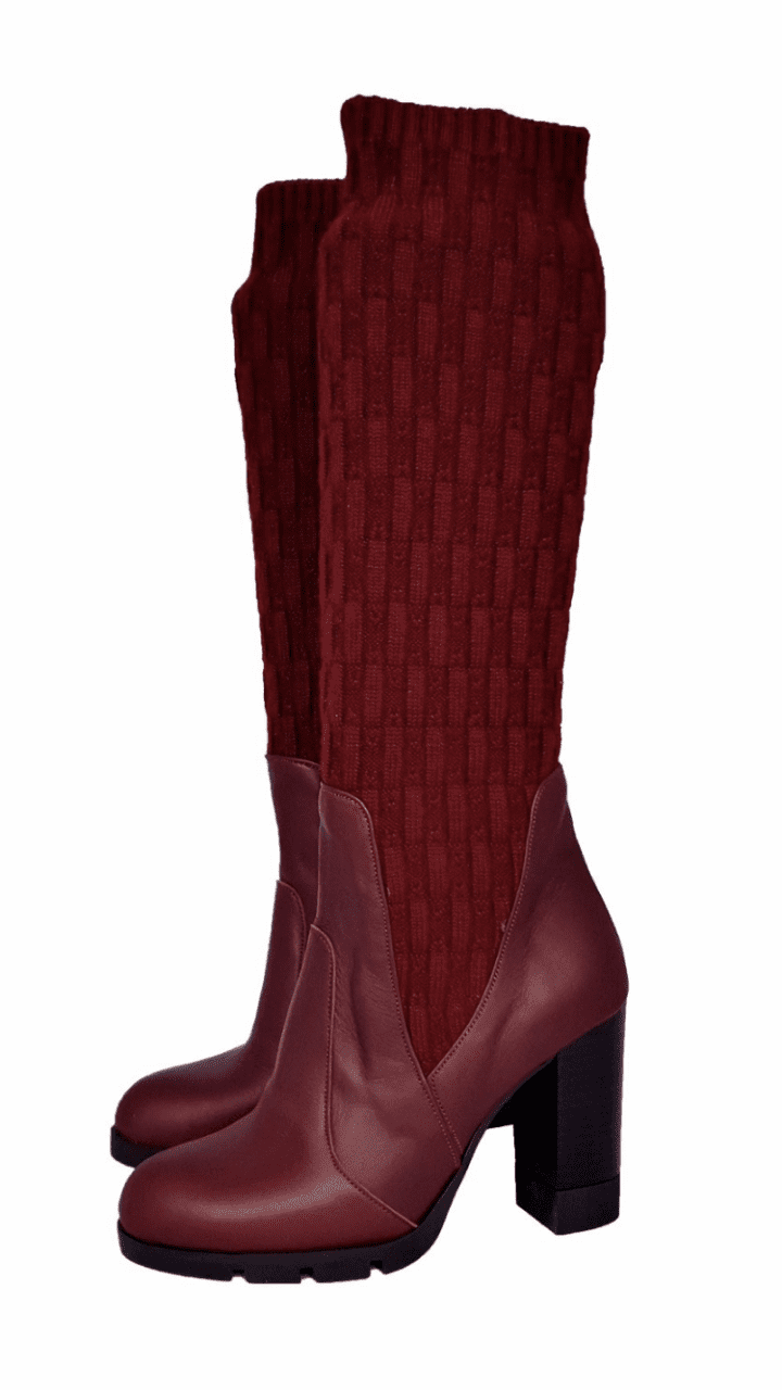 Δερμάτινη μπορντό μπότα με τακούνι 8 εκ.